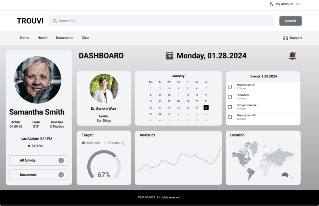 The platform was designed to enhance the digital experience for seniors family members and staff in assisted living facilities. It provides a clear, easily navigable interface that focuses on presenting essential information, from personal goals to analytics.